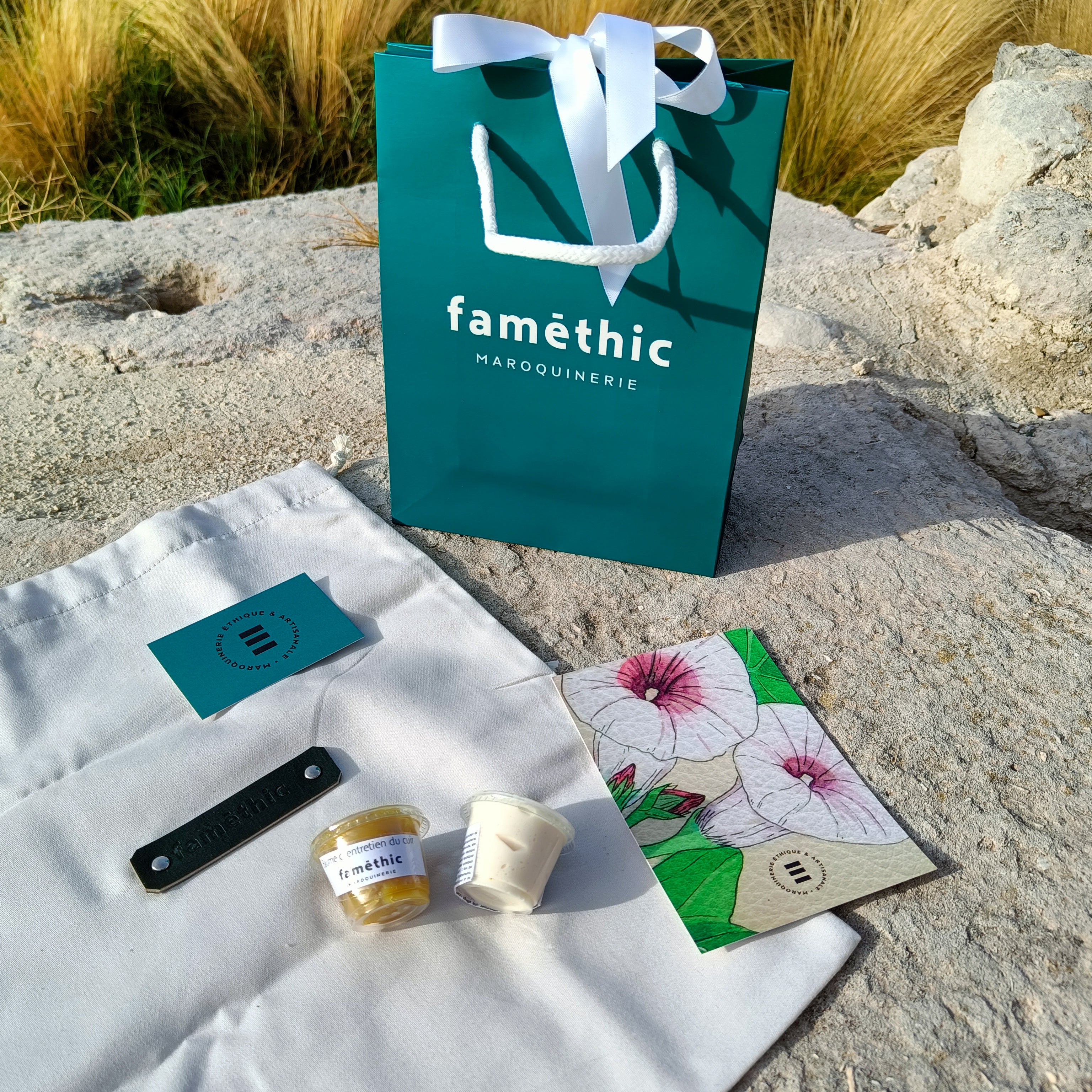 Lorsque Valérie achène la fabrication d'une pièce de maroquinerie, elle veille à l'envelopper soigneusement dans un pochon en coton biologique. Fabriqué dans un ESAT à Marseille, celui-ci permet de la préserver de la poussière et de la lumière. Il permet également de la ranger précieusement dans votre valise lors d'un voyage.